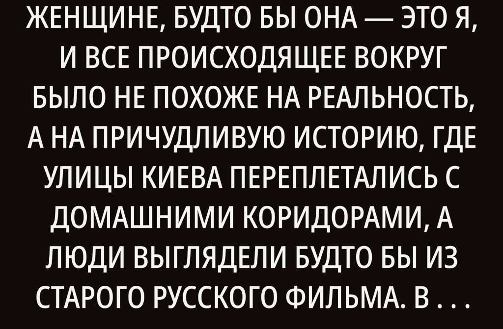 Мне снился странный сон о женщине, будто бы она это я, и все происходящее вокруг было не похоже на реальность, а на причудливую историю, где улицы Киева переплетались с домашними коридорами, а люди выглядели будто бы из старого русского фильма.