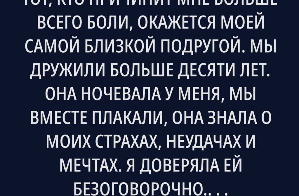 Никогда бы не подумала, что тот, кто причинит мне больше всего боли, окажется моей самой близкой подругой. Мы дружили больше десяти лет. Она ночевала у меня, мы вместе плакали, она знала о моих страхах, неудачах и мечтах. Я доверяла ей безоговорочно.