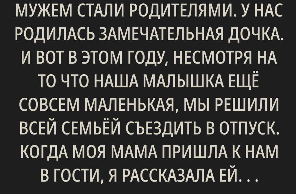 Полтора года назад мы с мужем стали родителями. У нас родилась замечательная дочка. И вот в этом году, несмотря на то что наша малышка ещё совсем маленькая, мы решили всей семьёй съездить в отпуск. Когда моя мама пришла к нам в гости, я рассказала ей о наших планах.
