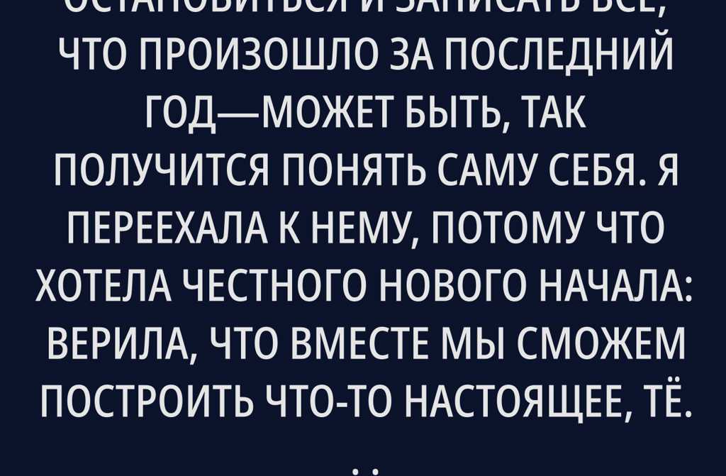Первые месяцы мне запомнились счастливыми: мы засыпали, обнимая друг друга, вместе готовили ужин, вечерами смотрели новые фильмы. Да, тесноватоно ведь это было наше место, наш уголок среди большого города. А потом он, захлопнув дверь, однажды вечером вдруг сообщил, что маме срочно нужна помощь с деньгами, а сестра вообще осталась без крыши над головой. Говорил«всего на пару дней, пока не найдут выход». Я не стала спорить, не хотела выглядеть бессердечной.