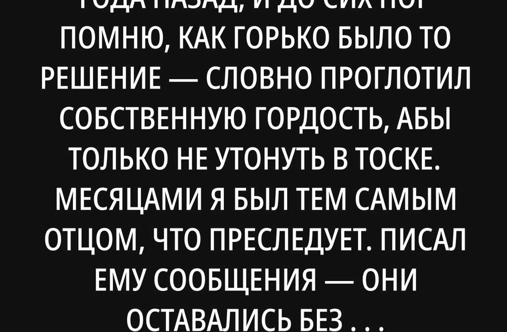 Месяцами я был тем самым отцом, что преследует. Писал ему сообщения они оставались без ответа. Звонил, а телефон долго гудел, пока не садилась батарея. Оставлял голосовые с сухим в горле: умолял дать мне пять минут всего пять чтобы понять, когда и за что я был вычеркнут из его жизни. Засыпал поздно, перебирая старые свои промахи: тот раз, когда рука сама неодобрительно легла на плечо, когда приходил из цеха измотанный и не хотел слушать, когда обещал быть рядом и не приходил. Молча стыдился: неужели я сам разрушил самое дорогое, что хотел сохранить?