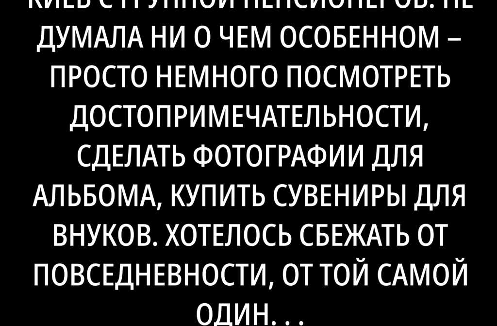 Отправилась я на экскурсию в Киев с группой пенсионеров. Не думала ни о чем особенном просто немного посмотреть достопримечательности, сделать фотографии для альбома, купить сувениры для внуков. Хотелось сбежать от повседневности, от той самой одинокой тишины, что с каждым годом становилась все настойчивей.