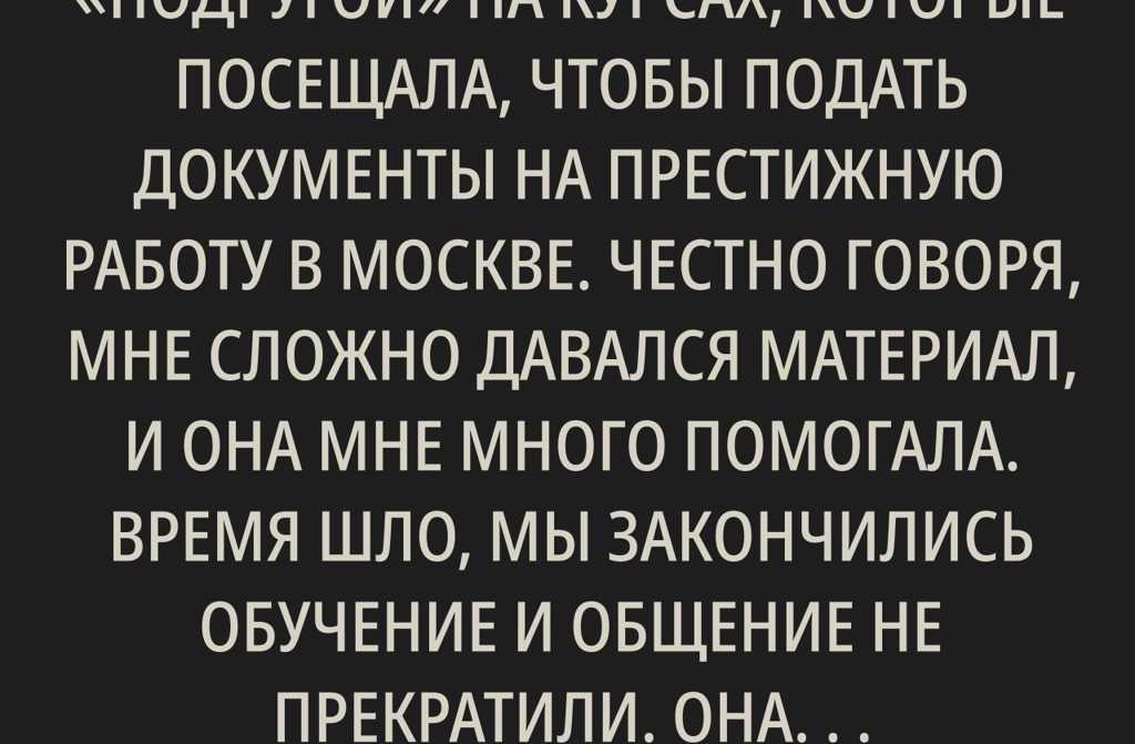 Я познакомилась с моей «подругой» на курсах, которые посещала, чтобы подать документы на престижную работу в Москве. Честно говоря, мне сложно давался материал, и она мне много помогала. Время шло, мы закончились обучение и общение не прекратили. Она все еще жила за счет родителей, а я уже была замужем и не могла рассчитывать на чью-то помощь.