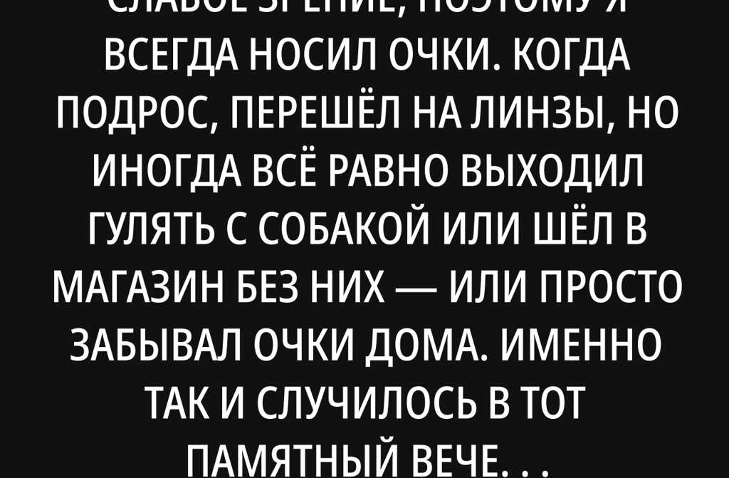 С самого детства у меня было слабое зрение, поэтому я всегда носил очки. Когда подрос, перешёл на линзы, но иногда всё равно выходил гулять с собакой или шёл в магазин без них или просто забывал очки дома. Именно так и случилось в тот памятный вечер. В спешке собрался в магазин: выскочил из квартиры, сбежал по лестнице с пятого этажа (лифта у нас не было) и только тогда понял, что забыл очки. Возвращаться было лениво, решил пойти так.