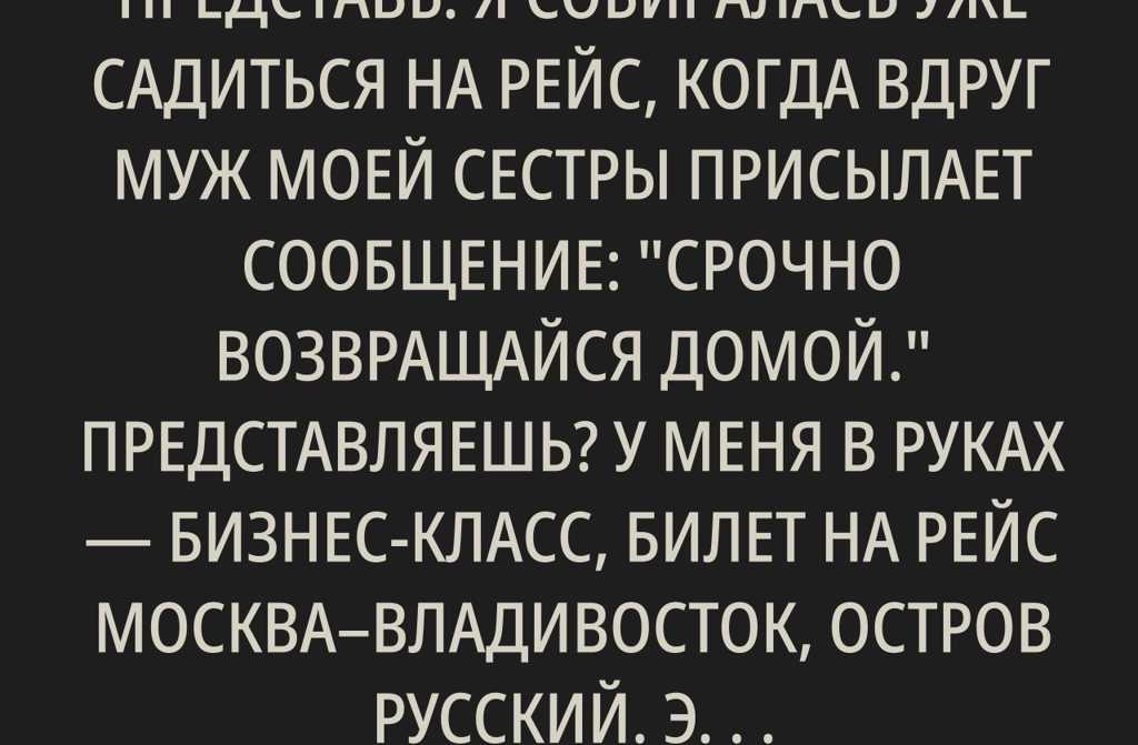 Я сейчас тебе такое расскажу представь: я собиралась уже садиться на рейс, когда вдруг муж моей сестры присылает сообщение: “Срочно возвращайся домой.” Представляешь? У меня в руках бизнес-класс, билет на рейс МоскваВладивосток, остров Русский. Это типа эксклюзивного пансионата у них там даже связи нормальной нет, чтобы никто тебя не потревожил. Одно из тех мест, куда миллиардеры уезжают на неделю посидеть в тишине, без интернета и телефонов.