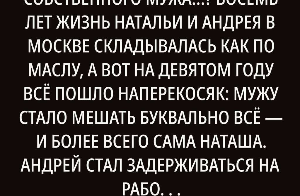 Восемь лет жизнь Натальи и Андрея в Москве складывалась как по маслу, а вот на девятом году всё пошло наперекосяк: мужу стало мешать буквально всё и более всего сама Наташа.