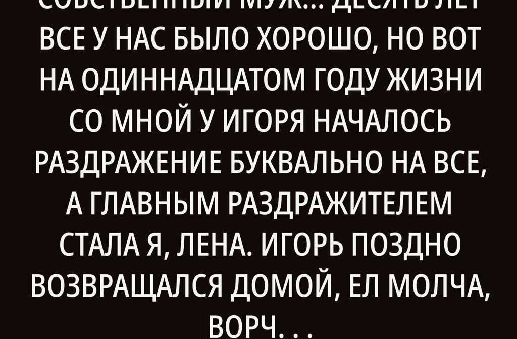 Десять лет все у нас было хорошо, но вот на одиннадцатом году жизни со мной у Игоря началось раздражение буквально на все, а главным раздражителем стала я, Лена.