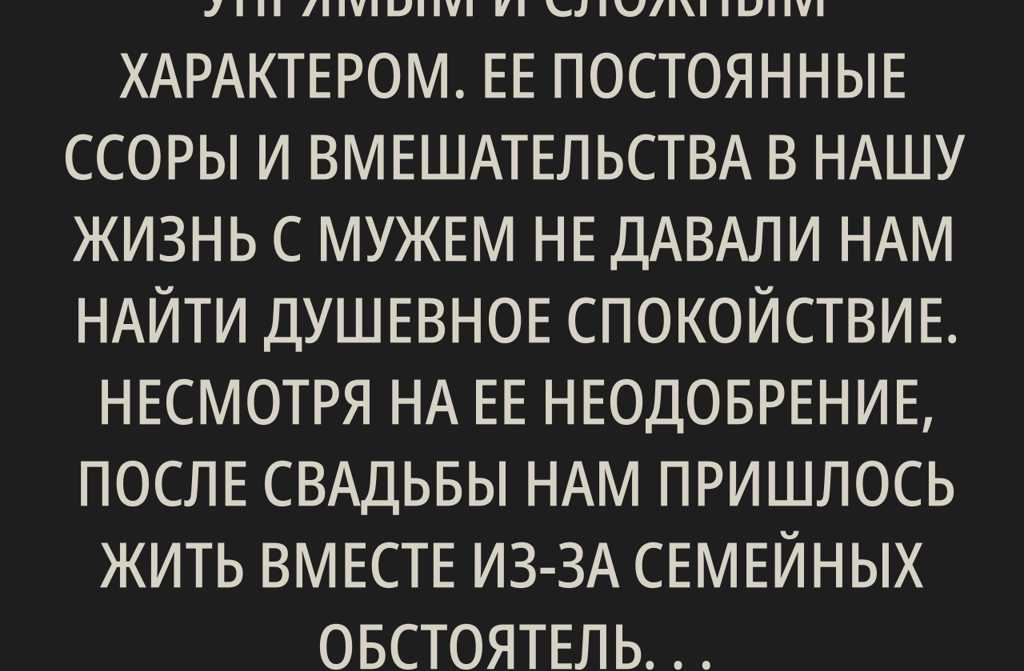 В конце концов мы решили снять отдельную квартиру и жить самостоятельно, что принесло нам долгожданное облегчение и позволило обрести душевный покой. Иногда мы навещали ее, но я принципиально отказывалась пить чай у нее в гостях это был мой тихий протест против ее поведения. Думаю, она понимает причину такой реакции, но ей, скорее всего, все равно.