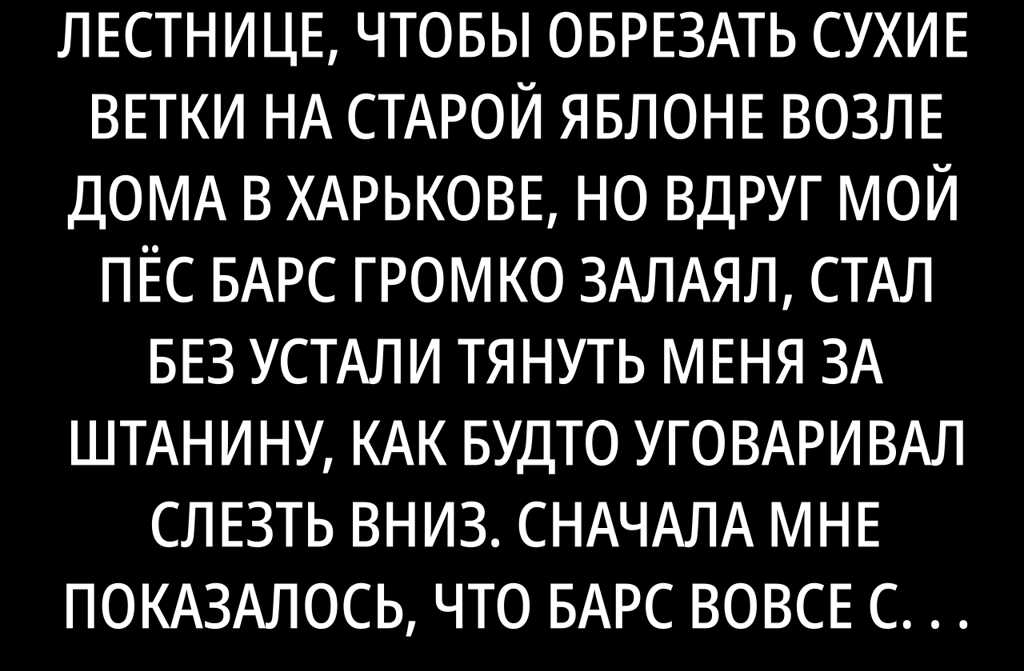 Я начал забираться по лестнице, чтобы обрезать сухие ветки на старой яблоне возле дома в Харькове, но вдруг мой пёс Барс громко залаял, стал без устали тянуть меня за штанину, как будто уговаривал слезть вниз. Сначала мне показалось, что Барс вовсе сошёл с ума или просто балуется, но, признаюсь честно, я всерьёз испугался: ведь так недолго упасть с лестницы из-за непослушного пса