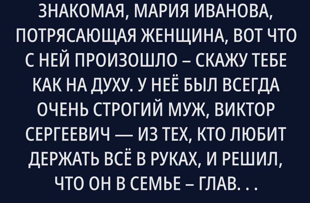 Представляешь, родная, у меня знакомая, Мария Иванова, потрясающая женщина, вот что с ней произошло скажу тебе как на духу. У неё был всегда очень строгий муж, Виктор Сергеевич из тех, кто любит держать всё в руках, и решил, что он в семье главный. Как положено, все решения принимал только он, уступать не привык. Всё должно быть по его правилам: чтобы дома уют, чистота, еда вкусная, поданная с любовью. Ну и чтобы жена всегда дома и не работала, а он полностью обеспечивает семью. Так себе атмосфера, знаешь.