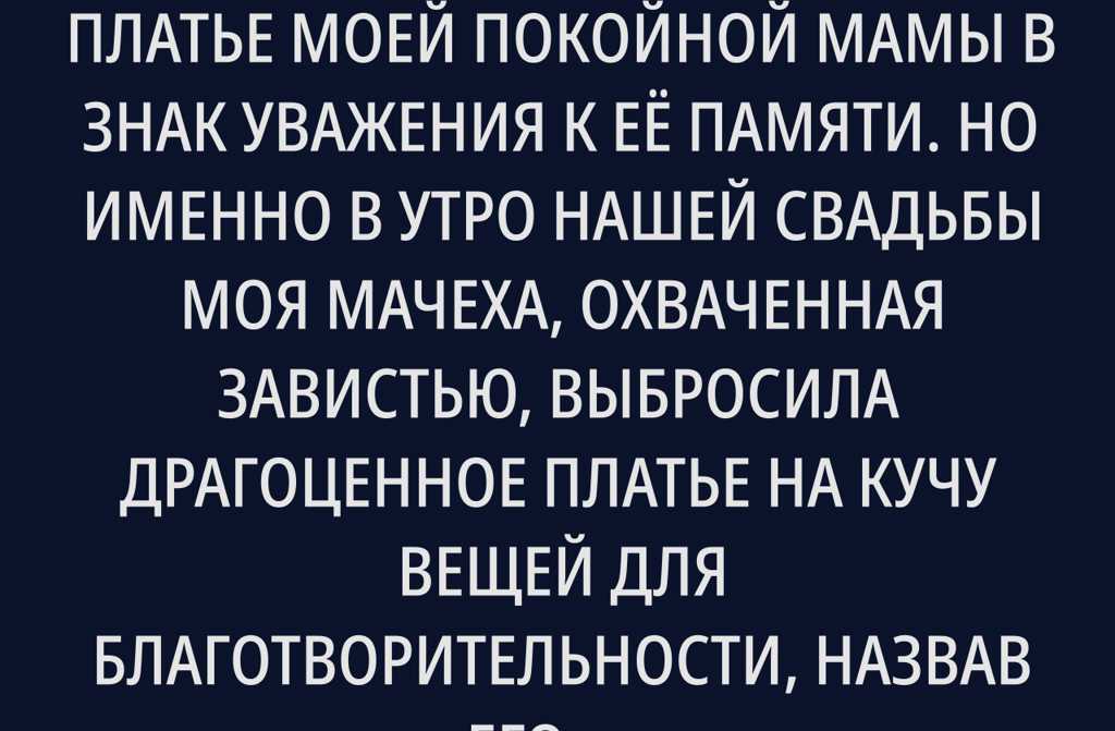 Я всегда мечтал, чтобы моя невеста надела свадебное платье моей покойной мамы в знак уважения к её памяти. Но именно в утро нашей свадьбы моя мачеха, охваченная завистью, выбросила драгоценное платье на кучу вещей для благотворительности, назвав его обычным «старьём». Она даже не подозревала, что мой отец всё слышал и не собирался позволять ей так поступить.