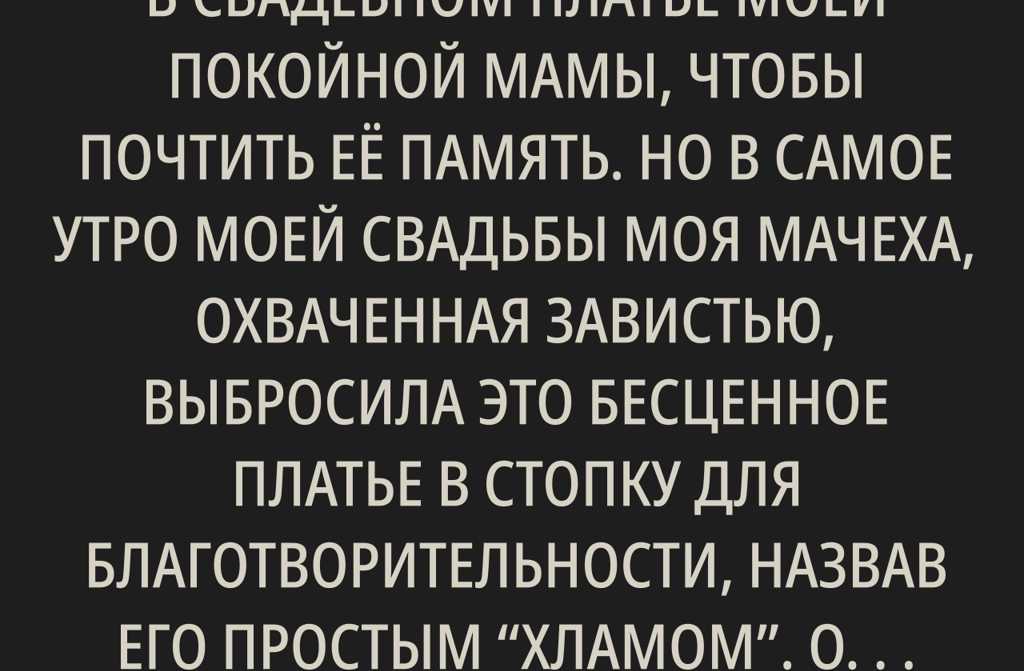 Я всегда мечтала выйти замуж в свадебном платье моей покойной мамы, чтобы почтить её память. Но в самое утро моей свадьбы моя мачеха, охваченная завистью, выбросила это бесценное платье в стопку для благотворительности, назвав его простым хламом. Она даже не подозревала, что мой отец услышал её слова и не собирался позволить ей так поступить.