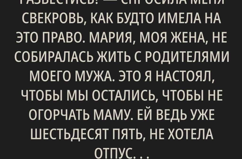 Почему ты решила развестись? спросила меня свекровь, как будто имела на это право. Мария, моя жена, не собиралась жить с родителями моего мужа. Это я настоял, чтобы мы остались, чтобы не огорчать маму. Ей ведь уже шестьдесят пять, не хотела отпускать сына. Мужчине тридцать четыре года! Но Мария тогда пожалела меня.