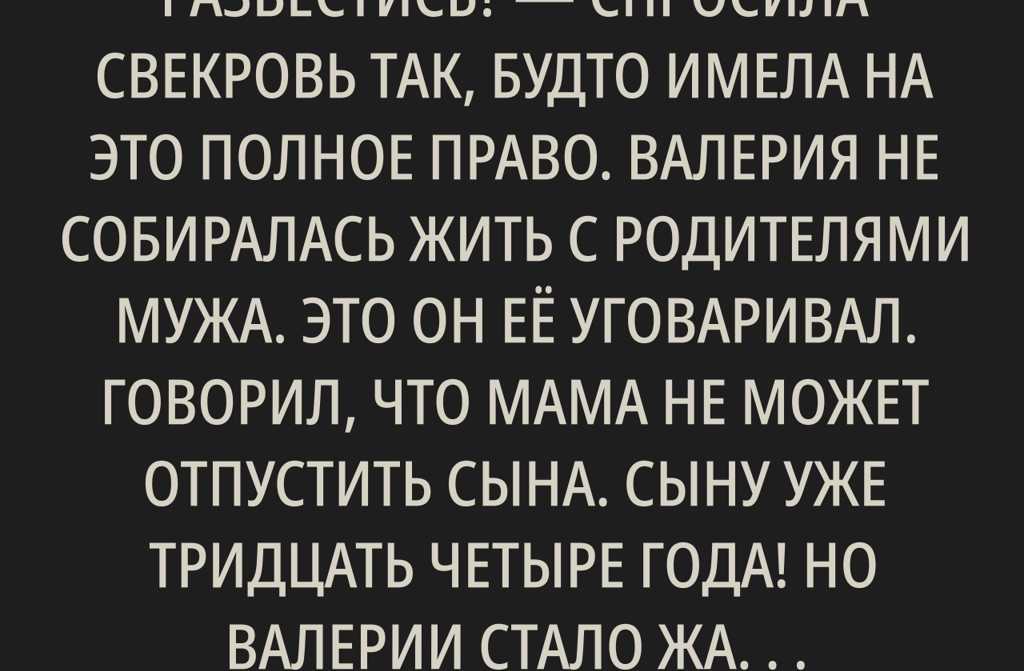 Почему ты решила развестись? спросила свекровь так, будто имела на это полное право. Валерия не собиралась жить с родителями мужа. Это он её уговаривал. Говорил, что мама не может отпустить сына. Сыну уже тридцать четыре года! Но Валерии стало жалко его.