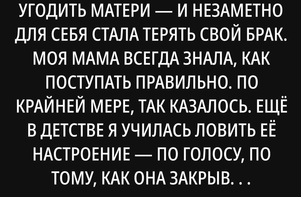 Моя мама всегда знала, как поступать правильно. По крайней мере, так казалось. Ещё в детстве я училась ловить её настроение по голосу, по тому, как она закрывала двери, по её тишине. Если мама была довольна всё шло своим чередом. Если нет значит, в чёмто я ошиблась.