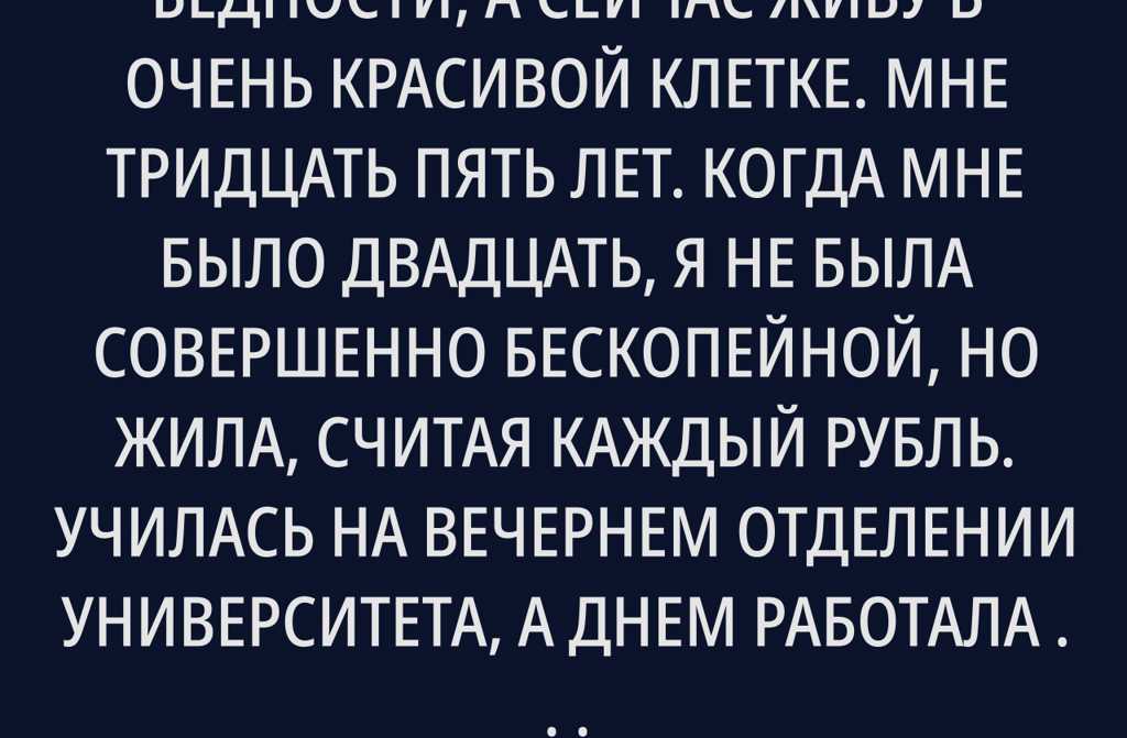 Я вышла замуж, чтобы уйти от бедности, а сейчас живу в очень красивой клетке. Мне тридцать пять лет. Когда мне было двадцать, я не была совершенно бескопейной, но жила, считая каждый рубль. Училась на вечернем отделении университета, а днем работала в небольшой пекарне на окраине Киева. Домой возвращалась усталая, с опухшими ногами, думая, хватит ли мне денег в этом месяце на проезд, учебные материалы, еду и коммунальные услуги. Я мечтала не о роскоши, а просто о стабильности и покое.