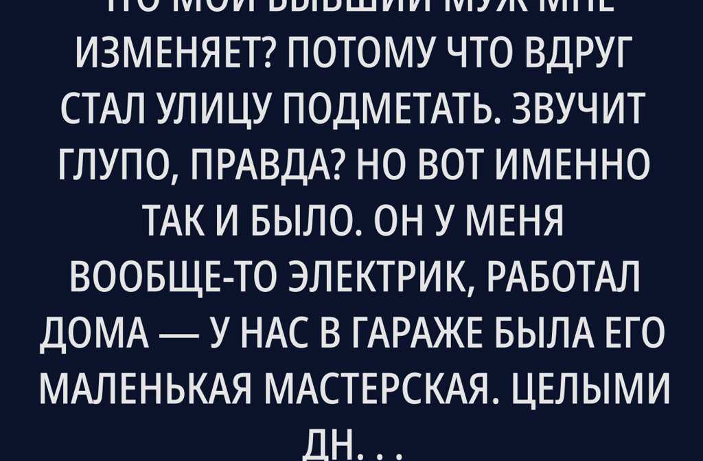 Представляешь, как я поняла, что мой бывший муж мне изменяет? Потому что вдруг стал улицу подметать. Звучит глупо, правда? Но вот именно так и было.