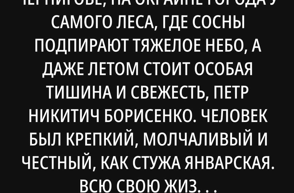 Жил в Чернигове, на окраине города у самого леса, где сосны подпирают тяжелое небо, а даже летом стоит особая тишина и свежесть, Петр Никитич Борисенко. Человек был крепкий, молчаливый и честный, как стужа январская.