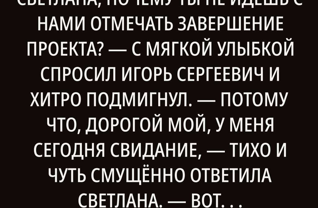 Вот это сюрприз! искренне удивился Игорь. Он знал Светлану уже больше пяти лет всегда спокойная, ответственная, мать-одиночка, казалось, совсем не интересующаяся личной жизнью… Хотя, кто знает. Может, он просто не замечал. Ну тогда не буду тебя задерживать. Пусть всё сложится как надо, сказал он, обернулся к коллегам. Ну что, народ, пошли?