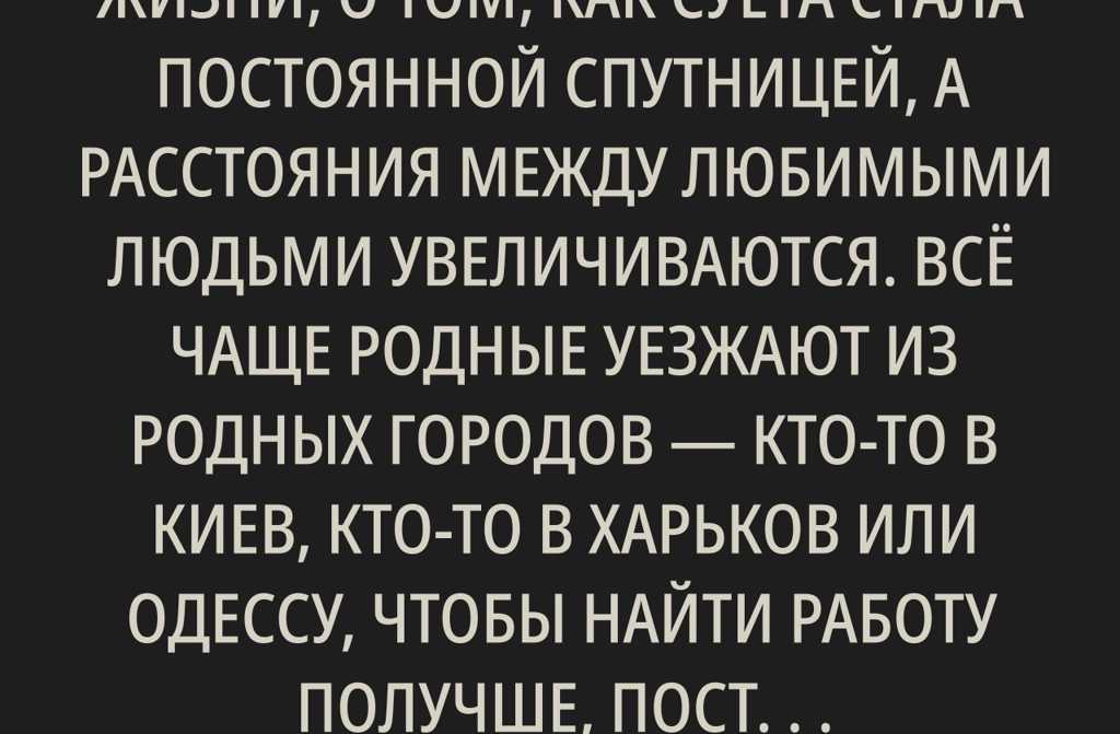 Сегодня я размышляю о нашей жизни, о том, как суета стала постоянной спутницей, а расстояния между любимыми людьми увеличиваются. Всё чаще родные уезжают из родных городов кто-то в Киев, кто-то в Харьков или Одессу, чтобы найти работу получше, построить новую жизнь. Вроде бы каждый из нас стремится к чему-то большему, но как же дорого порой обходится это желание ведь теряется самое ценное: ежедневное общение с близкими.