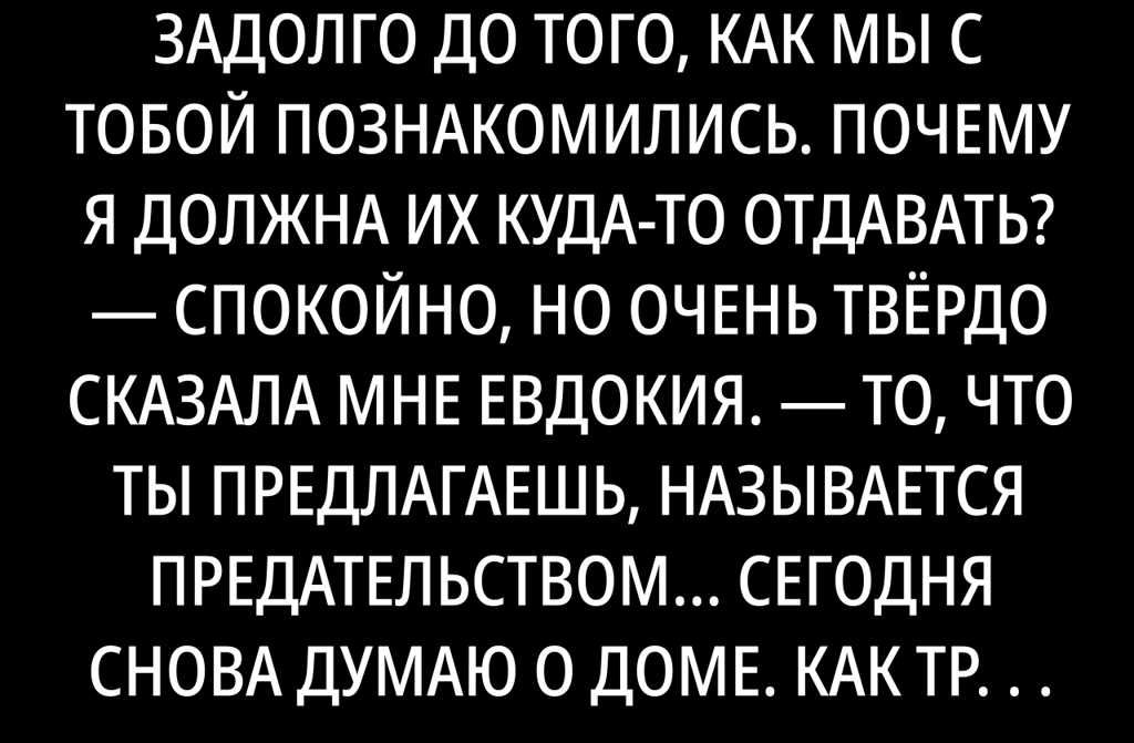 Ваня, эти кошки жили здесь задолго до того, как мы с тобой познакомились. Почему я должна их куда-то отдавать? спокойно, но очень твёрдо сказала мне Евдокия. То, что ты предлагаешь, называется предательством