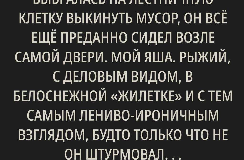 Когда я выбралась на лестничную клетку выкинуть мусор, он всё ещё преданно сидел возле самой двери. Мой Яша. Рыжий, с деловым видом, в белоснежной «жилетке» и с тем самым лениво-ироничным взглядом, будто только что не он штурмовал кухню и не свалил крышку с кастрюли. Я кивнула ему Яша даже ухом не дёрнул.