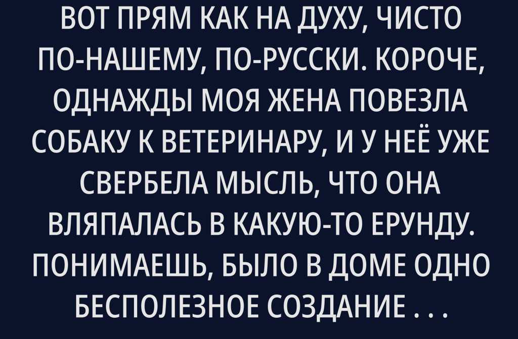 Короче, однажды моя жена повезла собаку к ветеринару, и у неё уже свербела мысль, что она вляпалась в какую-то ерунду. Понимаешь, было в доме одно бесполезное создание а теперь стало два…