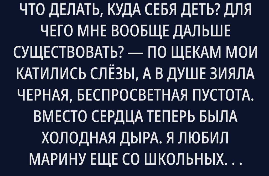 Как же мне теперь без тебя, Марина? Что мне делать? Почему жить? слёзы текли без устали, а в душе зияла пустота, где раньше было сердце.