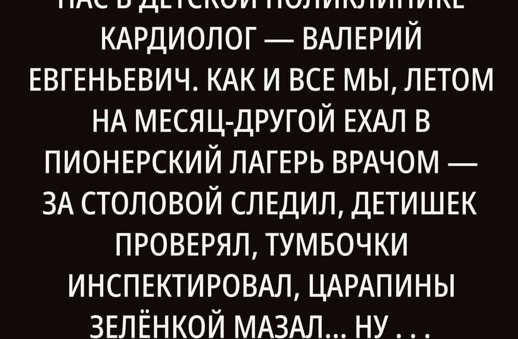 Работал у нас в детской поликлинике кардиолог Валерий Евгеньевич. Как и все мы, летом на месяц-другой ехал в пионерский лагерь врачом за столовой следил, детишек проверял, тумбочки инспектировал, царапины зелёнкой мазал… ну и, если ничего серьёзного не случится, слава богу.