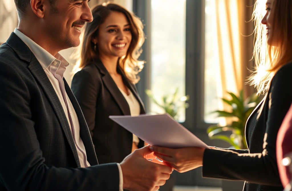 Он берёт лист, подписывает его и протягивает ей.