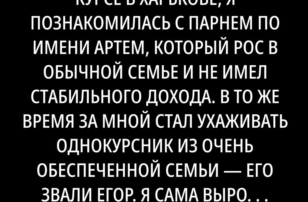 Когда я училась на третьем курсе в Харькове, я познакомилась с парнем по имени Артем, который рос в обычной семье и не имел стабильного дохода. В то же время за мной стал ухаживать однокурсник из очень обеспеченной семьи его звали Егор. Я сама выросла в небогатой семье и всегда мечтала о спокойной, счастливой жизни и немного большем комфорте и уверенности в завтрашнем дне.