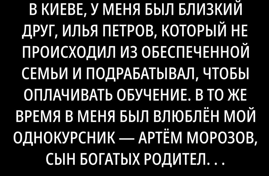 Когда я училась в университете в Киеве, у меня был близкий друг, Илья Петров, который не происходил из обеспеченной семьи и подрабатывал, чтобы оплачивать обучение. В то же время в меня был влюблён мой однокурсник Артём Морозов, сын богатых родителей, владеющих несколькими крупными фирмами. Я выросла в простой семье, где каждый рубль считался, и всегда мечтала о жизни без нужды, заботах и проблемах.