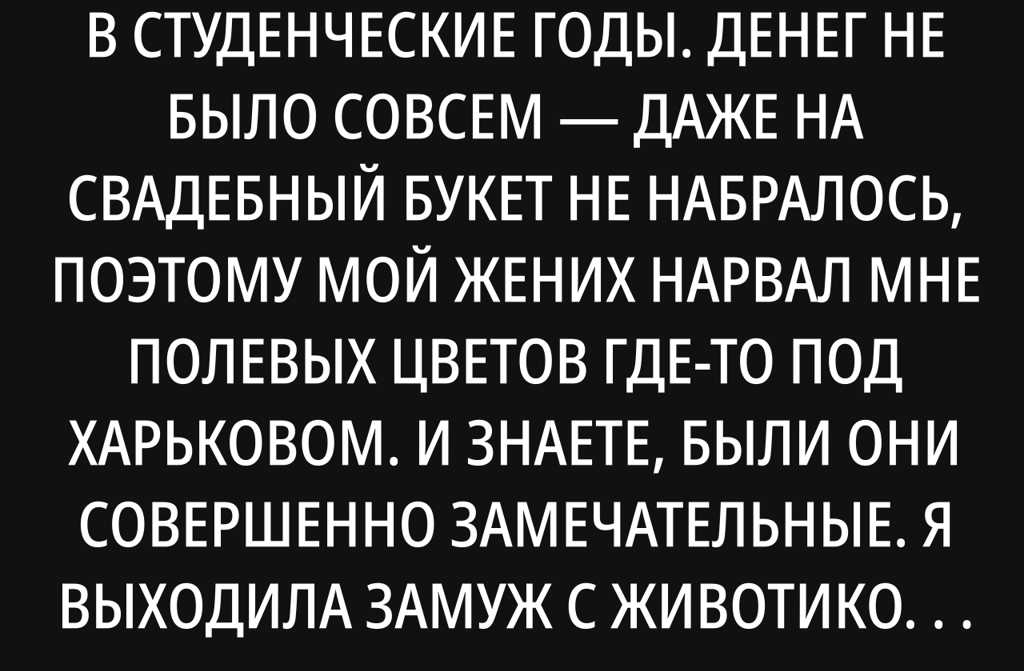 Влюбились мы друг в друга ещё в студенческие годы. Денег не было совсем даже на свадебный букет не набралось, поэтому мой жених нарвал мне полевых цветов где-то под Харьковом. И знаете, были они совершенно замечательные. Я выходила замуж с животиком, свадьба прошла, и после неё мы перебрались жить к моей маме. Пока я училась, мама нам здорово помогала: и с внучком, и с борщом, и с тем, чтобы не сойти с ума.