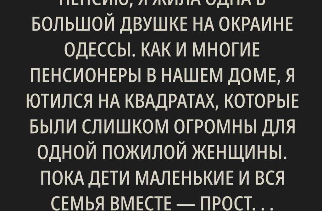 В тот момент, когда я вышла на пенсию, я жила одна в большой двушке на окраине Одессы. Как и многие пенсионеры в нашем доме, я ютился на квадратах, которые были слишком огромны для одной пожилой женщины. Пока дети маленькие и вся семья вместе просторная квартира просто необходима, но когда все разъехались, свободные комнаты становятся напоминанием о пустоте и одиночестве. Это не самое удобное положение, да и с хозяйством становится трудно ремонт нужен, мебель стареет, но ни сил, ни гривен у пенсионера на это по-настоящему нет.