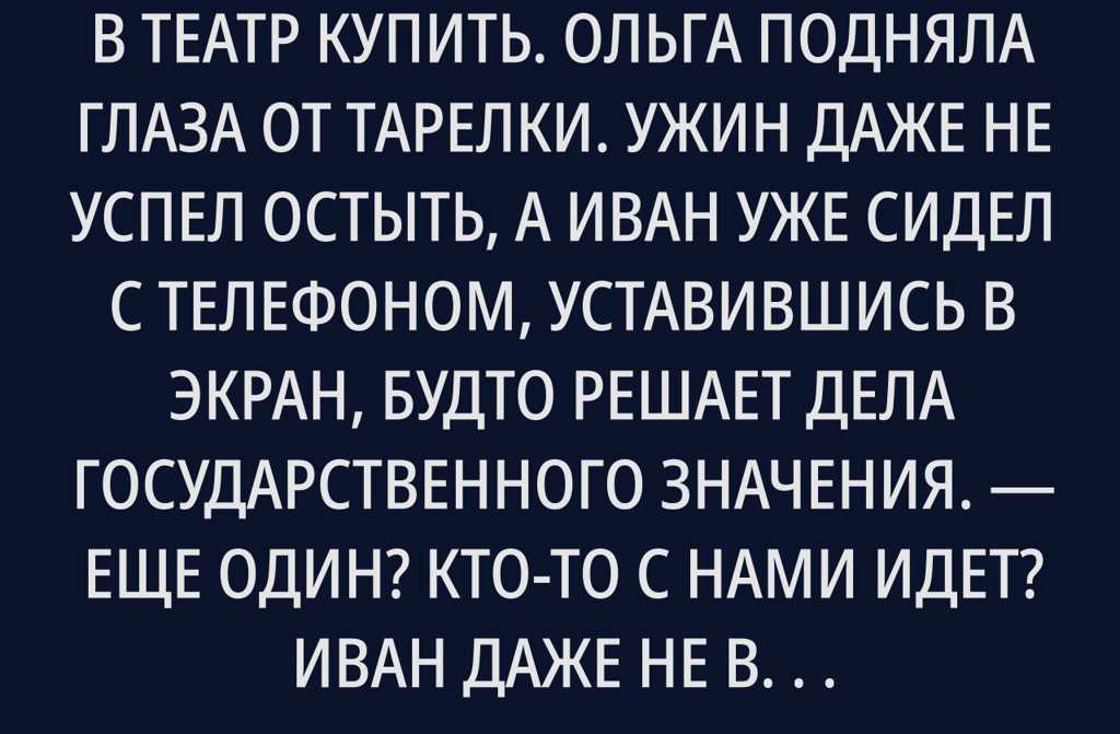 Валентина Павловна сидела справа, громко обсуждала с сыном программку, потом незнакомых людей в фойе, потом кого-то, кого увидела у гардероба. Ольга молча глядела на сцену, хотя занавес ещё был опущен. В антракте Иван увёл маму в буфет, а Ольгу даже не спросили, не хочет ли она пройти с ними. Они вернулись, обсуждая сюжет так, будто Ольга осталась за дверью. Она лишь задумалась: стоили ли эти билеты своих гривен?