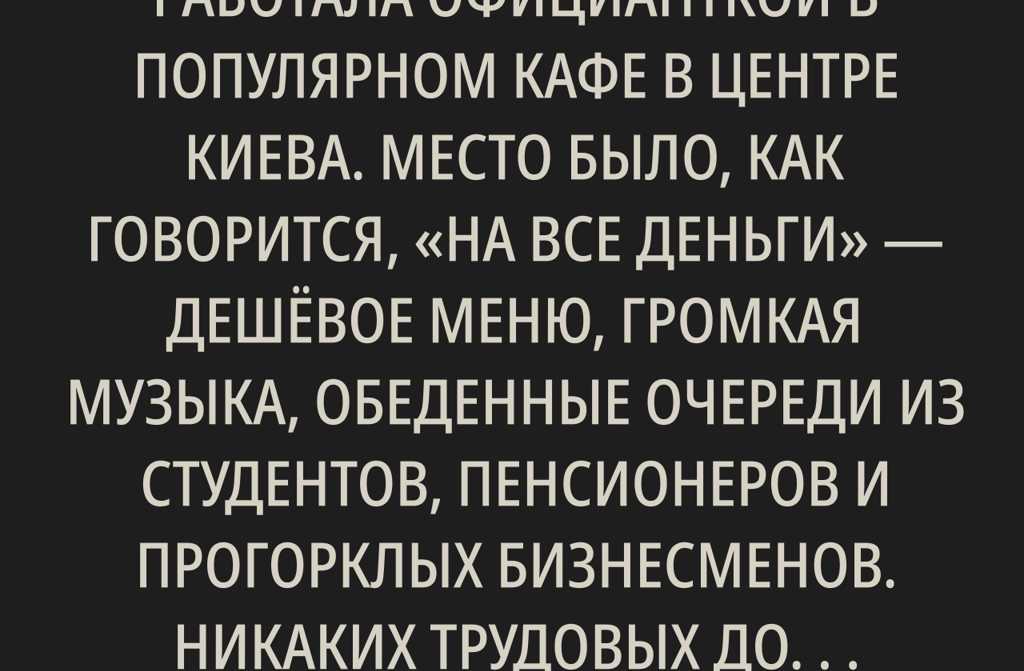 Когда мне было двадцать три, я работала официанткой в популярном кафе в центре Киева. Место было, как говорится, «на все деньги» дешёвое меню, громкая музыка, обеденные очереди из студентов, пенсионеров и прогорклых бизнесменов. Никаких трудовых договоров, никаких страховок всё по-украински: платят наличными в гривнах, сколько отработала, столько и дала. Заболеешь никому и дела нет, на больничный никто не отправляет. Если пропустила смену и ша, без денег. Но я всегда первая приходила, последняя уходила, меню знала, как таблицу умножения, да ещё терпела ворчливых клиентов, мыла столы на пустой желудок и с усталостью в глазах, потому что ну очень нужно было платить за квартиру.
