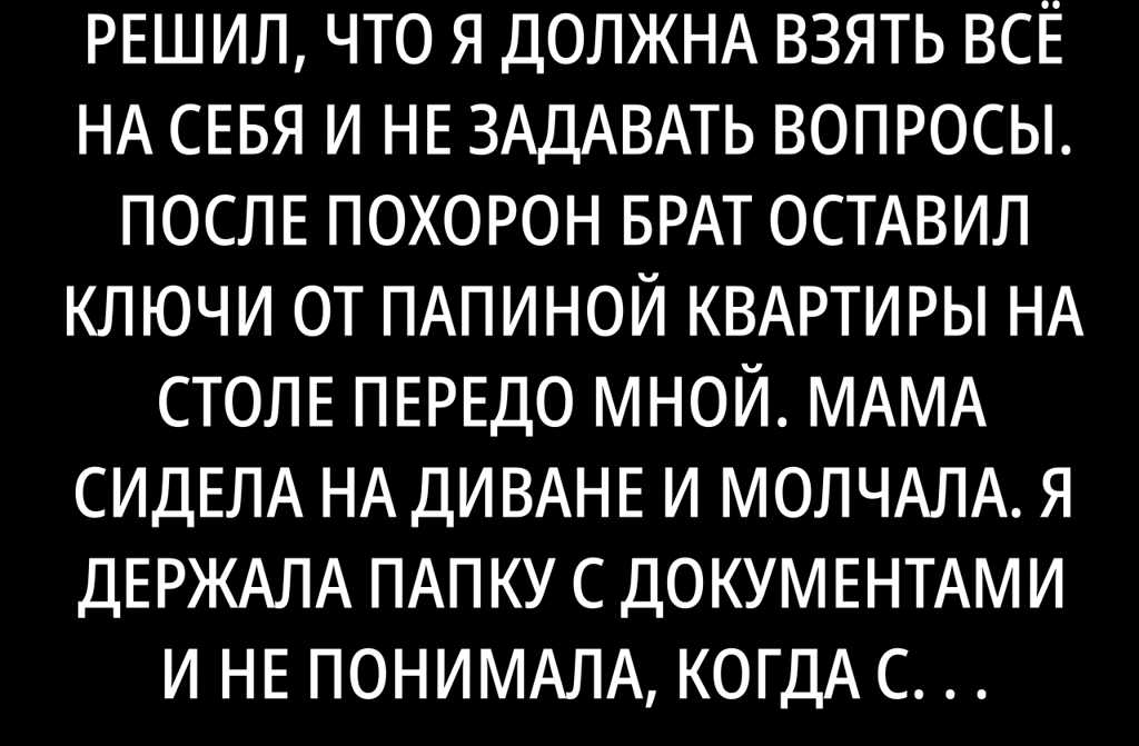 Когда папа ушёл к Богу, брат решил, что я должна взять всё на себя и не задавать вопросы. После похорон брат оставил ключи от папиной квартиры на столе передо мной. Мама сидела на диване и молчала. Я держала папку с документами и не понимала, когда стала человеком, которому нужно всё решать.