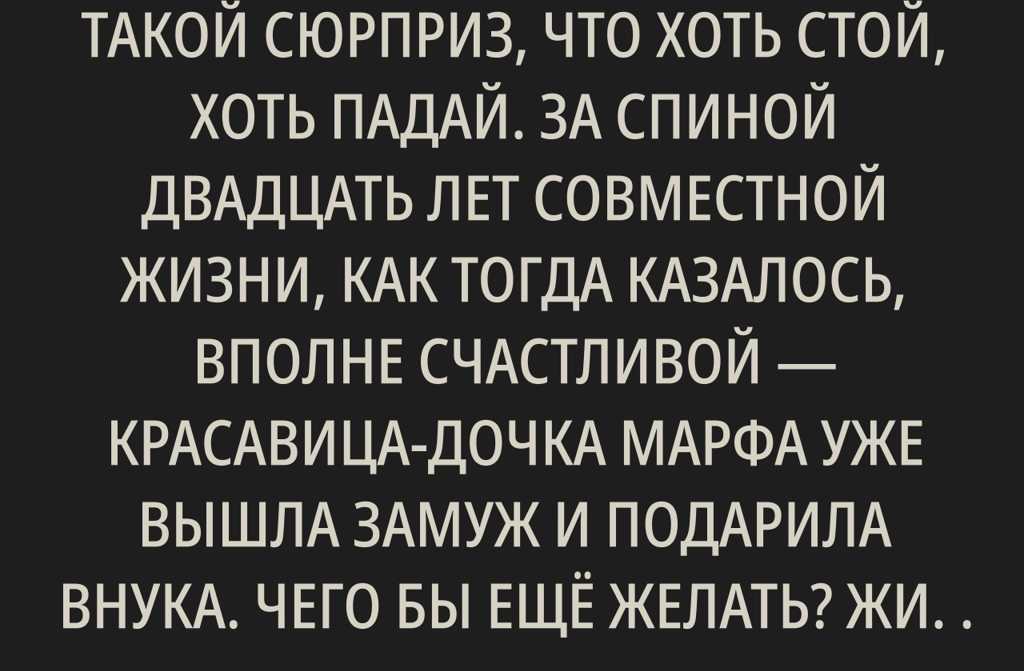 Перед самым Новым годом жена преподнесла Николаю такой сюрприз, что хоть стой, хоть падай. За спиной двадцать лет совместной жизни, как тогда казалось, вполне счастливой красавица-дочка Марфа уже вышла замуж и подарила внука. Чего бы ещё желать? Живи да радуйся.
