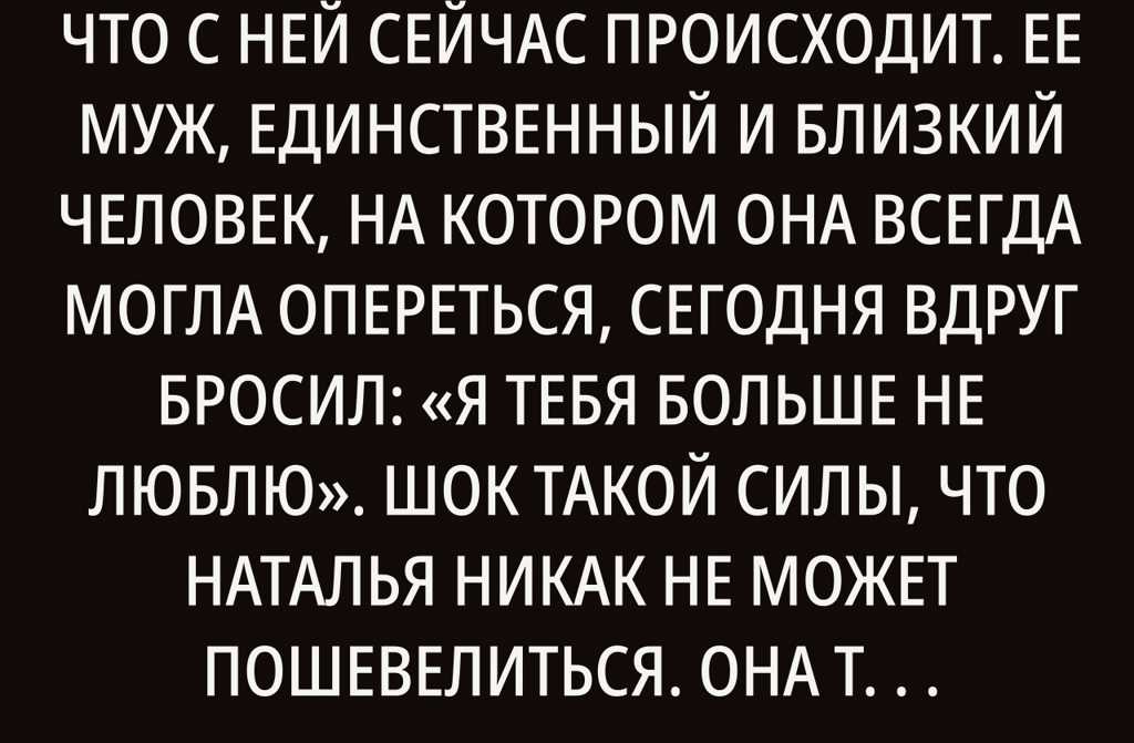Наталья не может поверить в то, что с ней сейчас происходит. Ее муж, единственный и близкий человек, на котором она всегда могла опереться, сегодня вдруг бросил: «Я тебя больше не люблю». Шок такой силы, что Наталья никак не может пошевелиться. Она так и застывает, пока муж суетится по квартире, торопливо кидает вещи в сумку и громыхает ключами по коридору. Ну вот, этого-то ей сейчас точно и не хватало… Совсем недавно внезапно скончался отец Натальи, и ей пришлось собраться с силами и заботиться о поседевшей маме и младшей сестре Ане, которая после тяжёлой черепно-мозговой травмы осталась инвалидом в восемнадцать лет. Семья живет в соседнем районном центре. Сын Ярослав только-только пошёл в первый класс. В июне, к тому же, закрылось ее предприятие она осталась без работы. Теперь и муж ушёл…