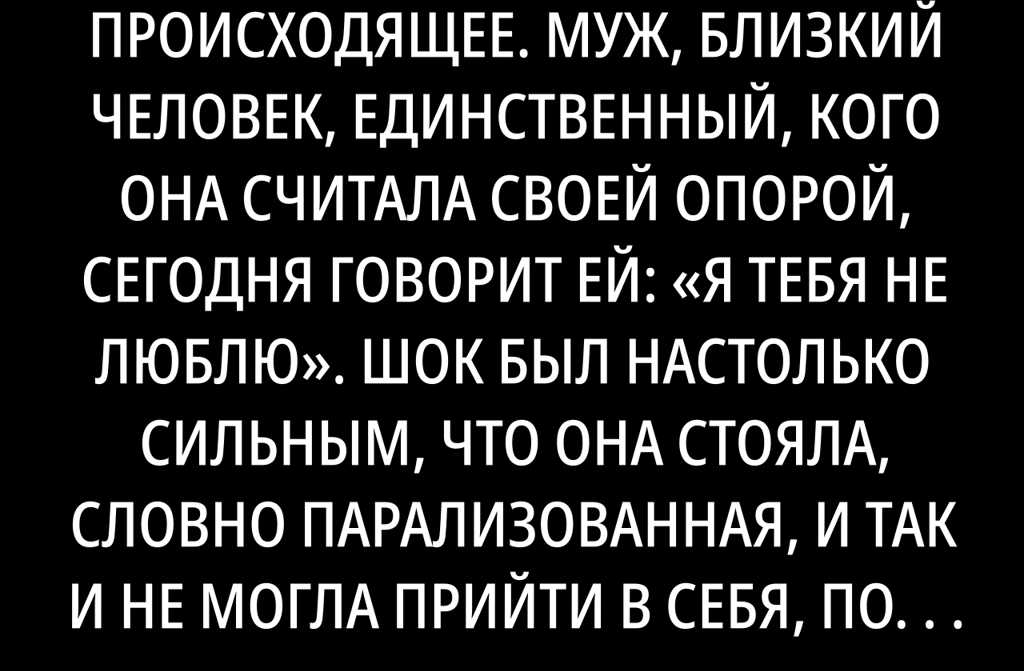 Наташа до сих пор не верит в происходящее. Муж, близкий человек, единственный, кого она считала своей опорой, сегодня говорит ей: «Я тебя не люблю».