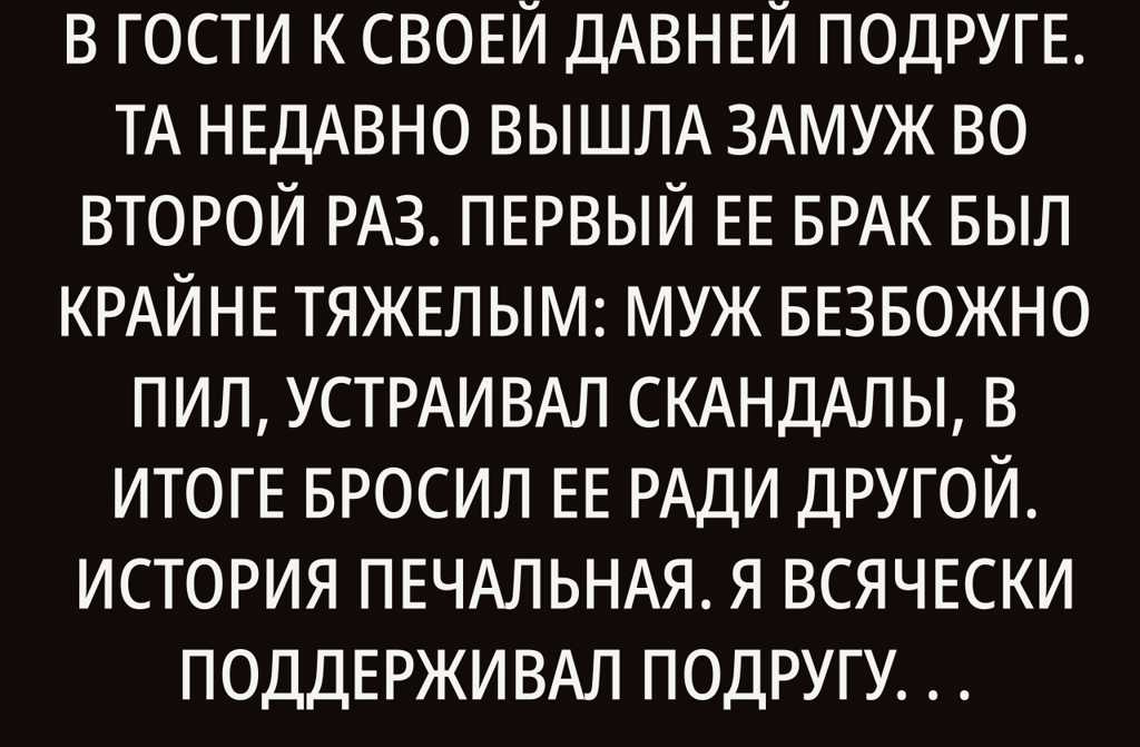 Однажды одна женщина зашла в гости к своей давней подруге. Та недавно вышла замуж во второй раз. Первый ее брак был крайне тяжелым: муж безбожно пил, устраивал скандалы, в итоге бросил ее ради другой. История печальная. Я всячески поддерживал подругу, помогал чем мог, пытался утешить Ведь для этого и существуют настоящие друзья, не так ли?