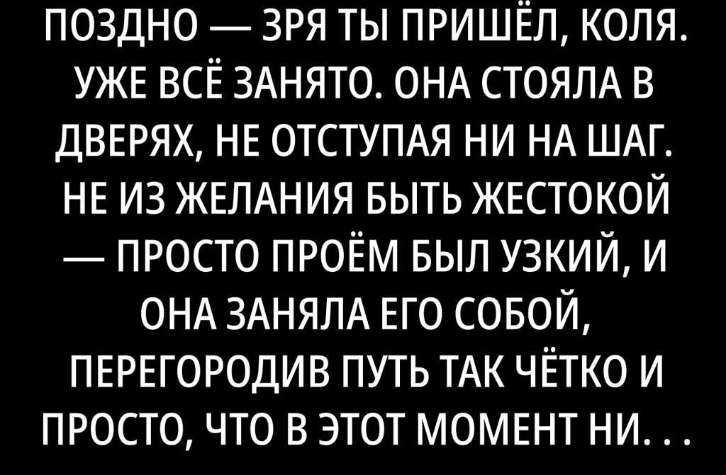 Она стояла в дверях, не отступая ни на шаг. Не из желания быть жестокой просто проём был узкий, и она заняла его собой, перегородив путь так чётко и просто, что в этот момент Николай вдруг почувствовал: всё уже решено, ничего не изменить.