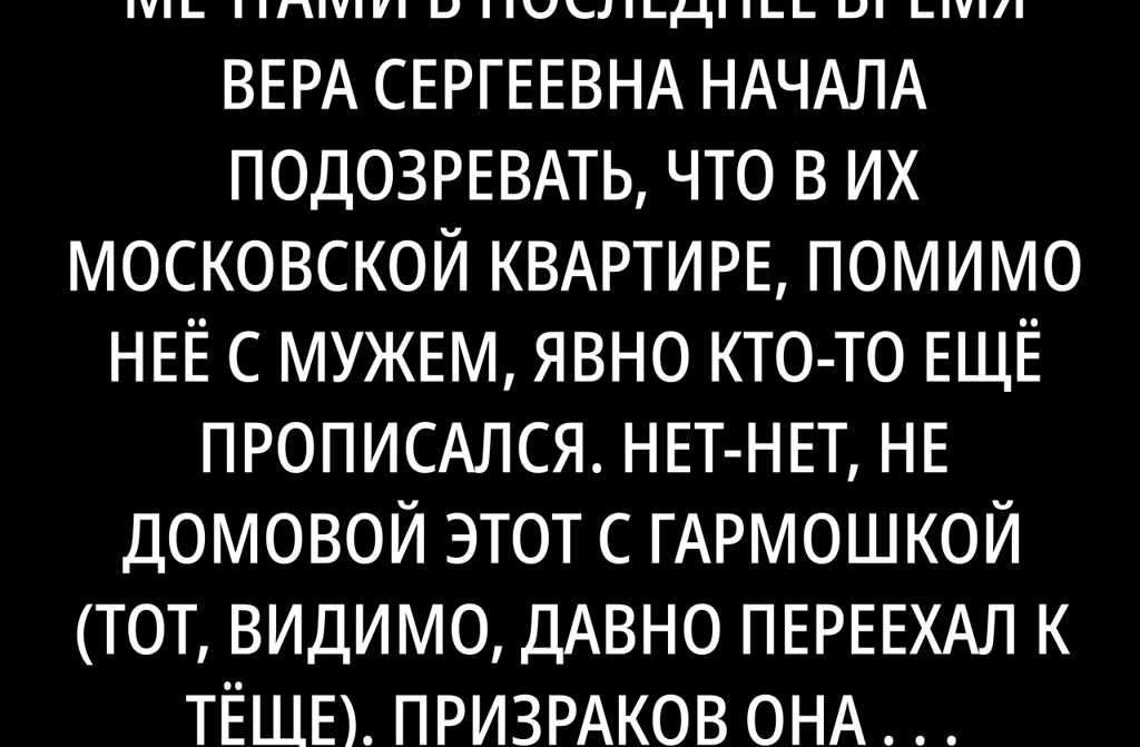В последнее время Вера Сергеевна начала подозревать, что в их московской квартире, помимо неё с мужем, явно кто-то ещё прописался. Нет-нет, не домовой этот с гармошкой (тот, видимо, давно переехал к тёще). Призраков она тоже исключила если и есть, то люди уважаемые: пачкаться по мелочам просто не в их стиле.