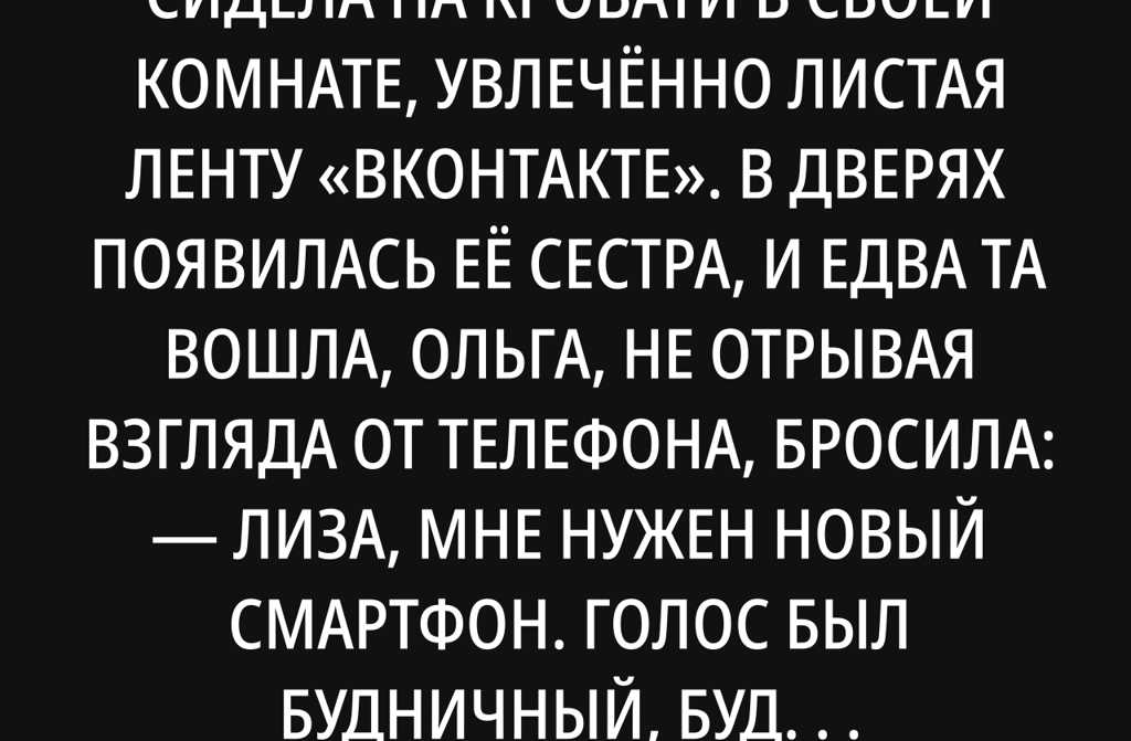 Ольга сидела на кровати в своей комнате, увлечённо листая ленту «ВКонтакте». В дверях появилась её сестра, и едва та вошла, Ольга, не отрывая взгляда от телефона, бросила: