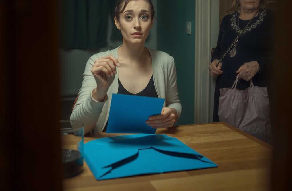 Ксения медленно разрывает край, заглядывает внутрь: лист А4, сложенный строго, и что-то плоское, бликующее в тени.