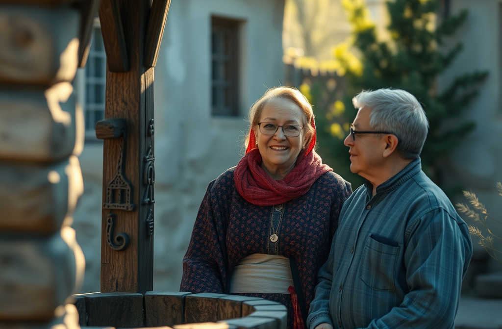 Анюта выходит из деревенского дома с полным ведром кормов для свиней и сердито проходит мимо мужа Геннадия, который уже третий день мастерит резной колодец на дворе. Захотелось ему, видите ли, красоту наводить, как будто дел больше нет! Анюта хозяйничает, по двору суетится, животных кормит, а этот опять стоит со стамеской, весь в опилках, и только смотрит на неё, улыбаясь. Вот муж попался: ни ласкового слова, ни голоса на хозяйство не повысит, всё молча работает и лишь изредка, пройдёт мимо, проведёт рукой по её русой толстой косе вся его нежность. А Анюте так хочется услышать и «звёздочка моя», и «лебёдушка»…