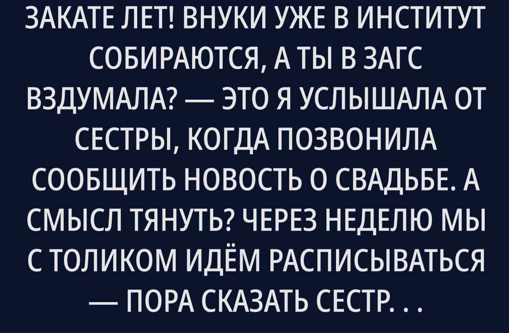 Любаня, ну ты и загнула на закате лет! Внуки уже в институт собираются, а ты в ЗАГС вздумала? это я услышала от сестры, когда позвонила сообщить новость о свадьбе.