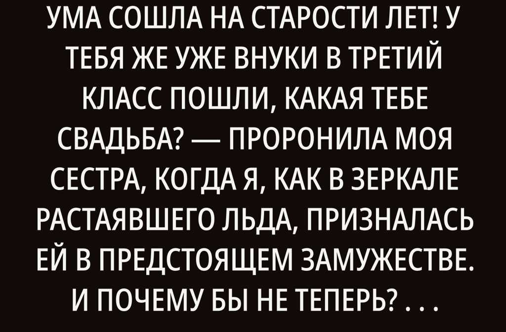 Люся, ну ты совсем, что ли, с ума сошла на старости лет! У тебя же уже внуки в третий класс пошли, какая тебе свадьба? проронила моя сестра, когда я, как в зеркале растаявшего льда, призналась ей в предстоящем замужестве.