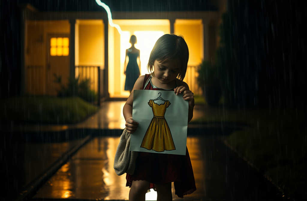 Сзади доносились крики мачехи сквозь гром и молнию: «Убирайся! Я не хочу кормить хромую паразитку!» Свет вспыхнул, и в лужах видно было, как Алина спотыкается по скользкой дороге. Нет крыши, нет родных только тихая вера, что Бог всё ещё смотрит. У дороги лежало битое зеркало, а капли дождя смешались с кровью на её колене. В дрожащих руках мокрый рисунок платья, вышитого золотой нитью.