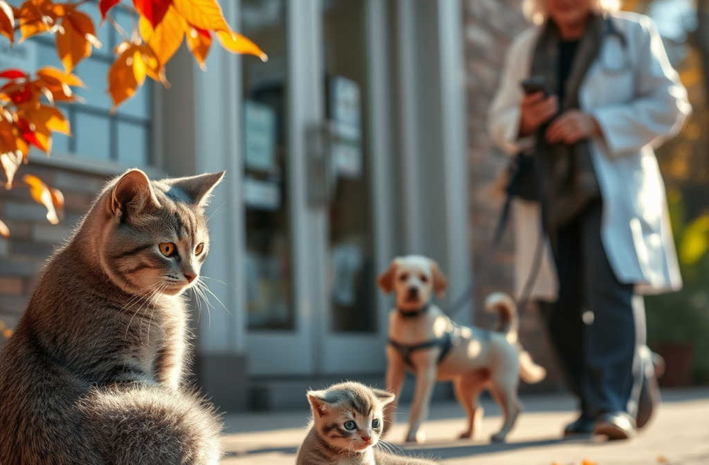 Маленький серый кот сидел у дверей ветеринарной клиники. Он жалобно мяукал, а у его лап лежал крошечный котёнок
